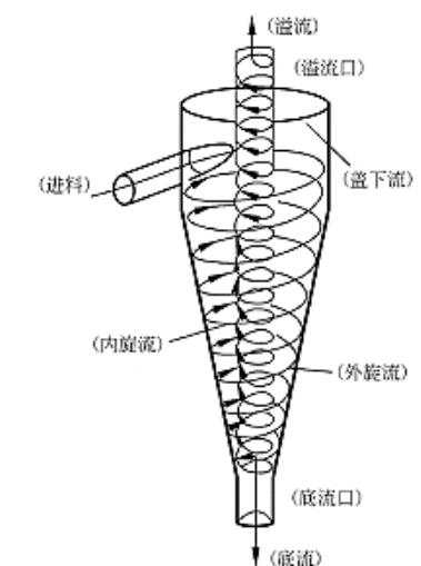 旋流器是一個帶有圓柱的錐形容器,椎體上部分叫液腔,液腔外側(cè)有一進液管,進液管以圓錐進液方向和液腔聯(lián)通。旋流器的頂端是上溢流口,底部是底流口,也叫排料口;旋流器內(nèi)部有一個空心的圓管沿旋流器軸線從頂部延伸至液腔里,這個圓管叫溢流管,也叫旋流定向器,其內(nèi)部形成上溢流通道以便泥漿向上溢流排除;旋流器的尺寸由椎體的最大內(nèi)徑?jīng)Q定。